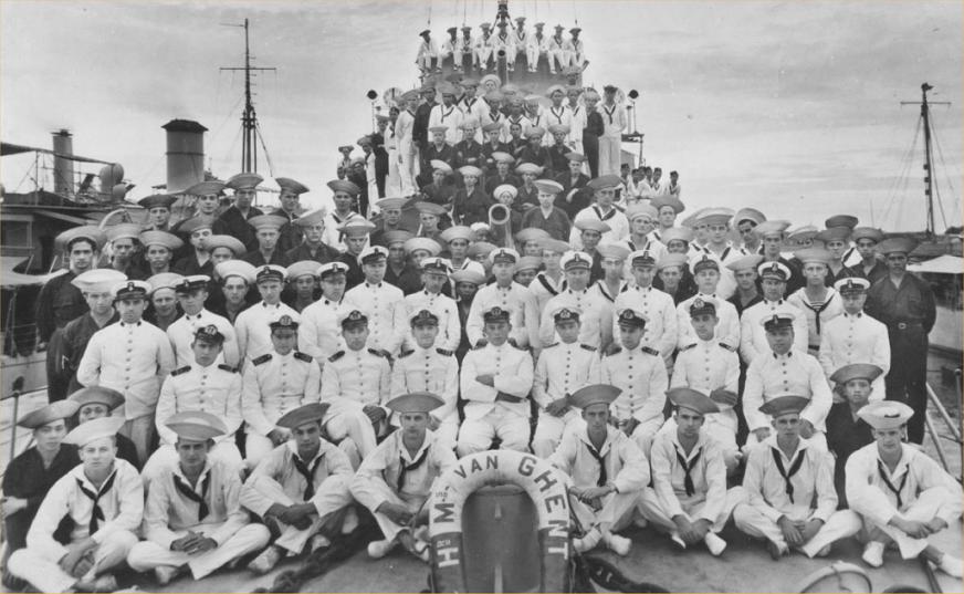 | Crew photo of the destroyer Van Ghent in the 1930s (Collection Tiest Markies). Can anyone say when and where? The destroyer De Ruyter was rechristened Van Ghent on October 1, 1934 so the photo was at least taken after that date. January, 2008: Replies to the thread on the dutchsubmarines.com forum (read the thread here) make it likely the officer in the centre is Lieutenant-Commander J.M.L.I. Chömpff. He commanded the Van Ghent between April 6, 1939 and December 23, 1940. He was eventually killed in action on board the destroyer Piet Hein during the Battle of Badung Strait. Another indication for this dating are the fire control clocks on either side of the bridge. These were installed shortly before, or in 1940. Special thanks to Leon Homburg and Rob Harmse for their assistance. |