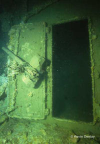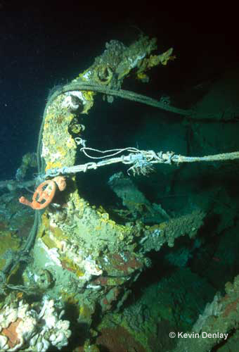 | Looking down onto one of Java�s dual 40mmm Bofors mounts, the breach and part of the barrels clearly visible, although the operators �protective enclosure� has mostly rotted away. Immediately aft of this Bofors station, where four of these weapons are situated in a cluster, the wreck ends abruptly in jagged wreckage, Java�s very stern having been sheared off by the torpedo that struck her. (Collection Kevin Denlay) | |